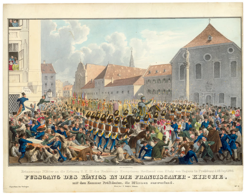 Eduard Gurk: Korunovácia Ferdinanda I. v Bratislave 1830 za uhorského kráľa, príchod do františkánskeho kostola, kolorovaná litografia, Galéria mesta Bratislavy