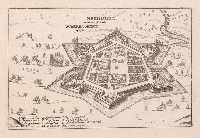 Pohľad na opevnenie Nových Zámkov so 6 bastiónmi, rytina z 1665, Galéria mesta Bratislavy
