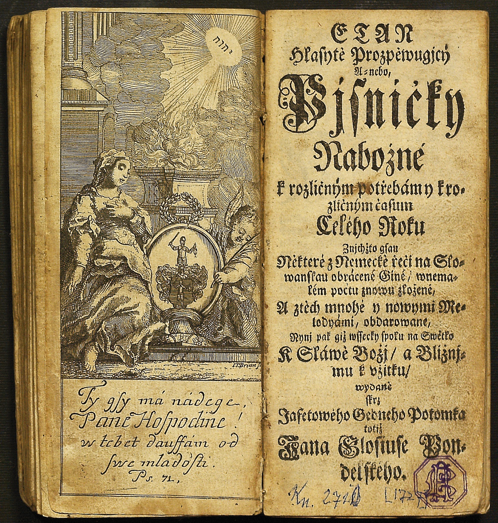 Ilustrácia k heslu kancionál Etan hlasitě prozpěvující anebo Písničky nábožné J. Glosia-Pondelského, protititul (frontispis) a titulný list, 1727, Ústredná knižnica SAV – Lyceálna knižnica, Bratislava Ďalšie informácie o ilustrácii Licenčné podmienky Voľné dielo Inštitúcia Ústredná knižnica SAV – Lyceálna knižnica, Bratislava Naspäť na stránku hesla